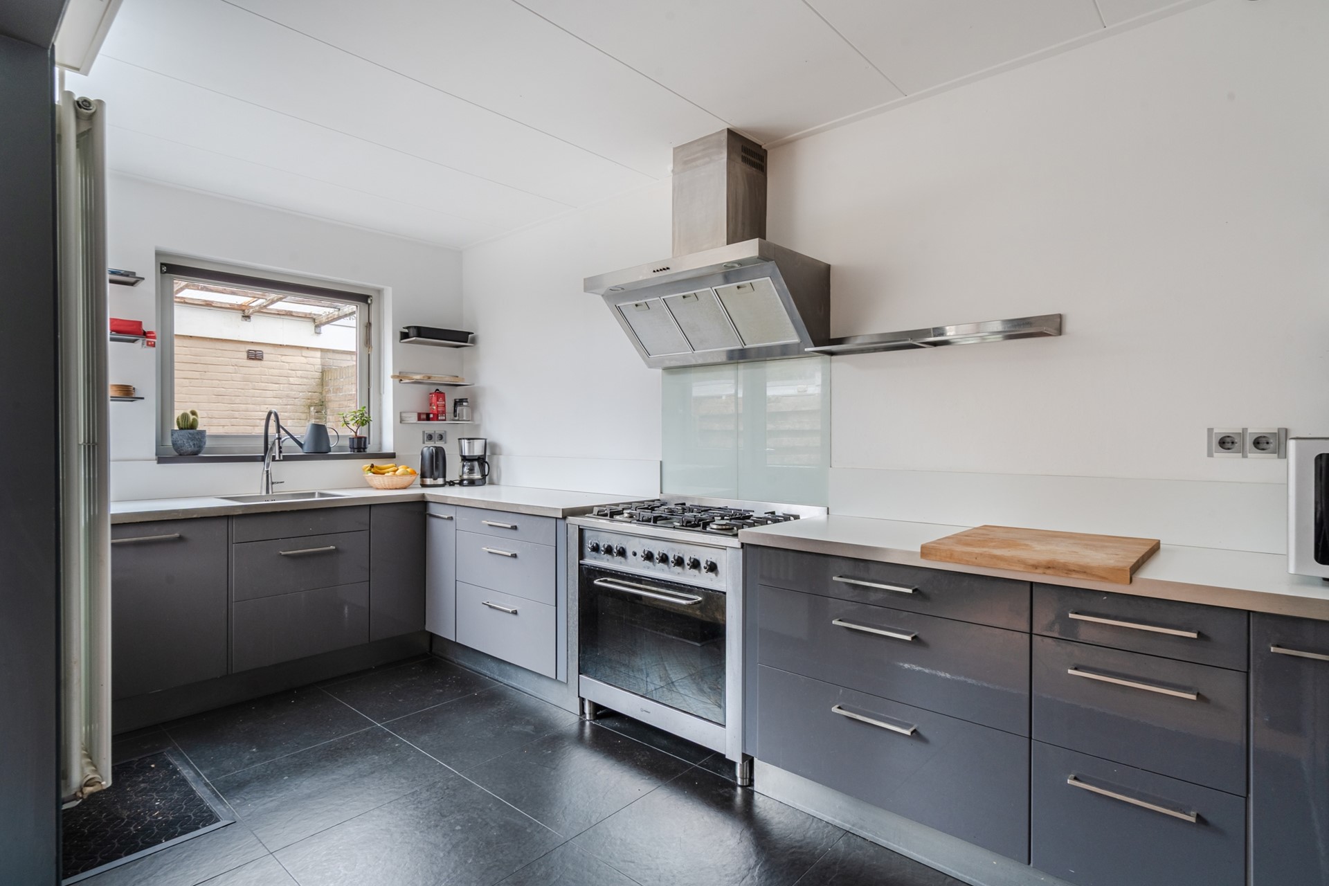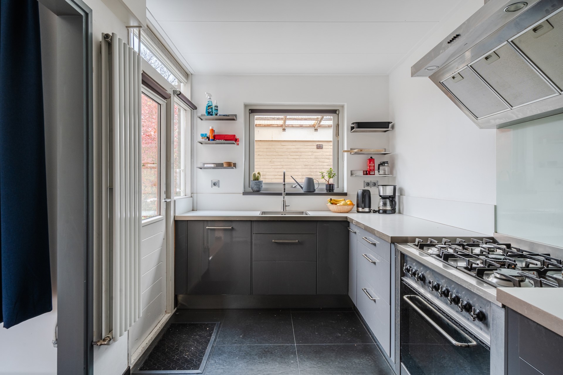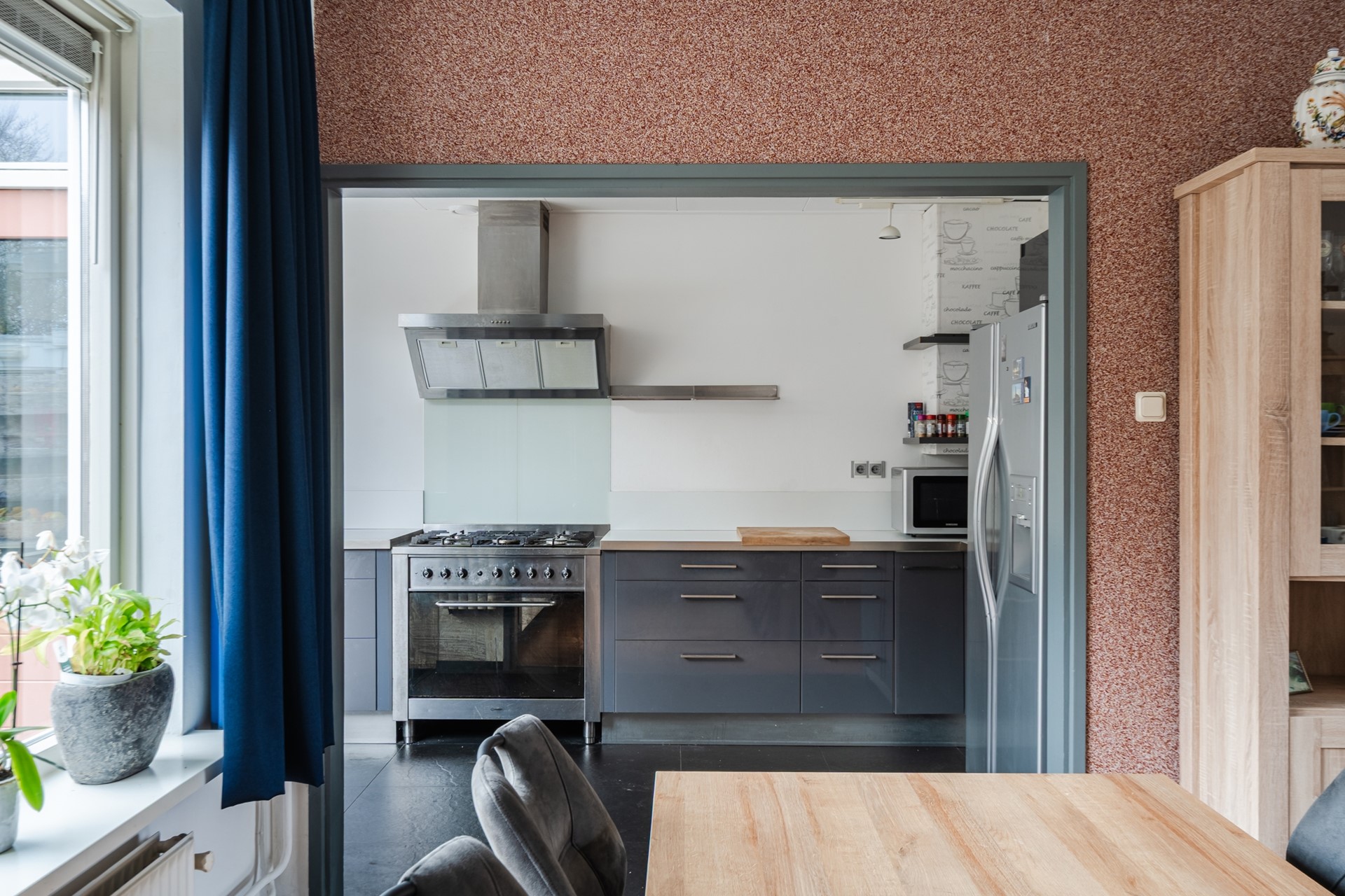 De open keuken heeft veel daglichtinval, is tuingericht in een ruime U-opstelling geplaatst met veel bruikbare werkbladruimte en voorzien van een RVS spoelbak met spoelkraan, een verplaatsbare snijplank, een 5-pits gasfornuis (Indesit en 100 cm. breed) met oven, een RVS afzuigkap, een grote Amerikaanse koel-vrieskast (Samsung), een onderbouw magnetron en een vaatwasser (vernieuwd in 2024). De keuken is verder voorzien van 2 carrouselkasten in de hoeken, een grote designradiator aan de wand en een plavuizenvloer, de kozijnen zijn voorzien van isolatieglas.