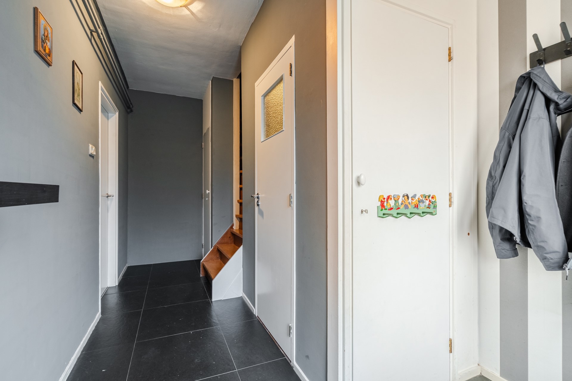Er hangt een deurluifel boven de voordeur en de verwarmde entree binnen is zeer ruim van opzet, voorzien van een plavuizenvloer en bied ruimte aan de garderobe, de meterkast en een kleine ‘kruipruimte’ waar de watermeter zit. De hal geeft toegang tot de toiletruimte, de trap naar de etage, de trapkast met wasmachine aansluiting en tot slot de woonkamer.