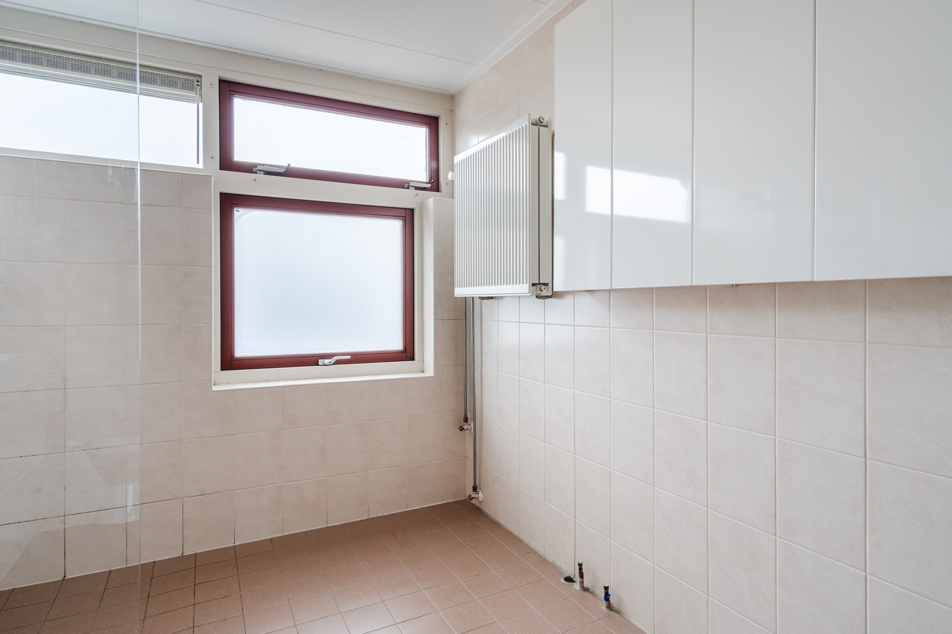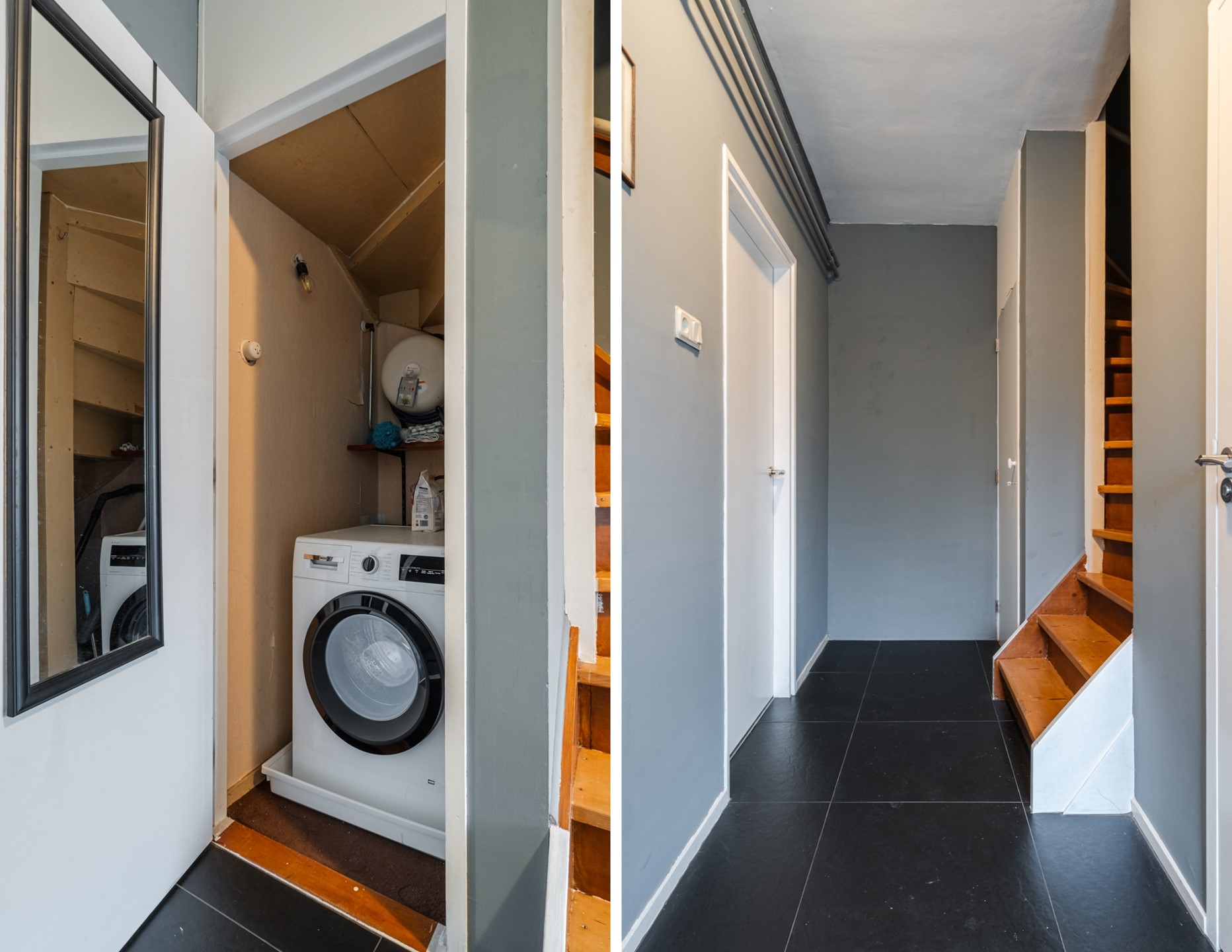 In de afsluitbare trapkast zijn de aansluitingen voor de wasmachine aanwezig, daarnaast is er nog extra bergruimte en een luik om toegang te krijgen tot de kruipruimte.